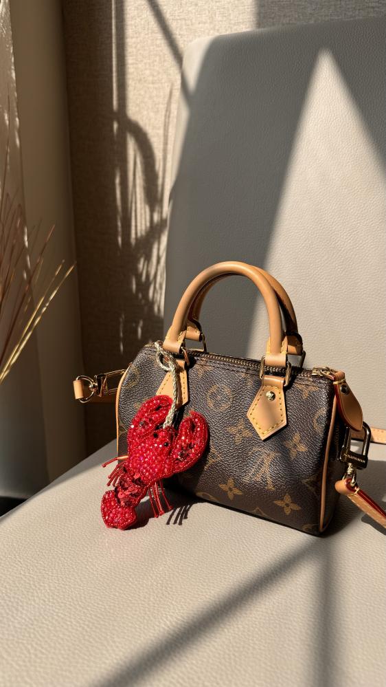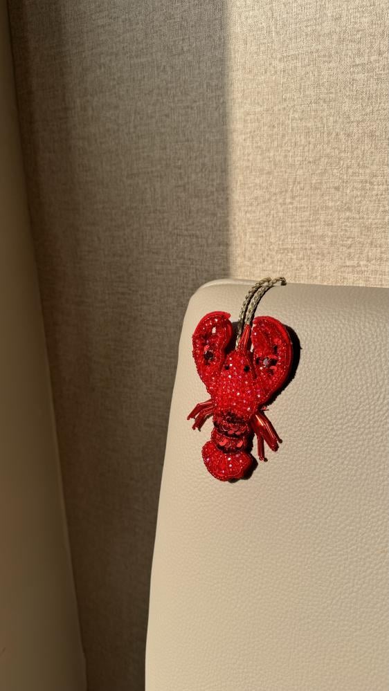 ميدالية على شكل لوبستر باللون الأحمر، مطرزة يدوياً بفصوص براقة تضيف لمسة فريدة ولافتة لحقيبتك